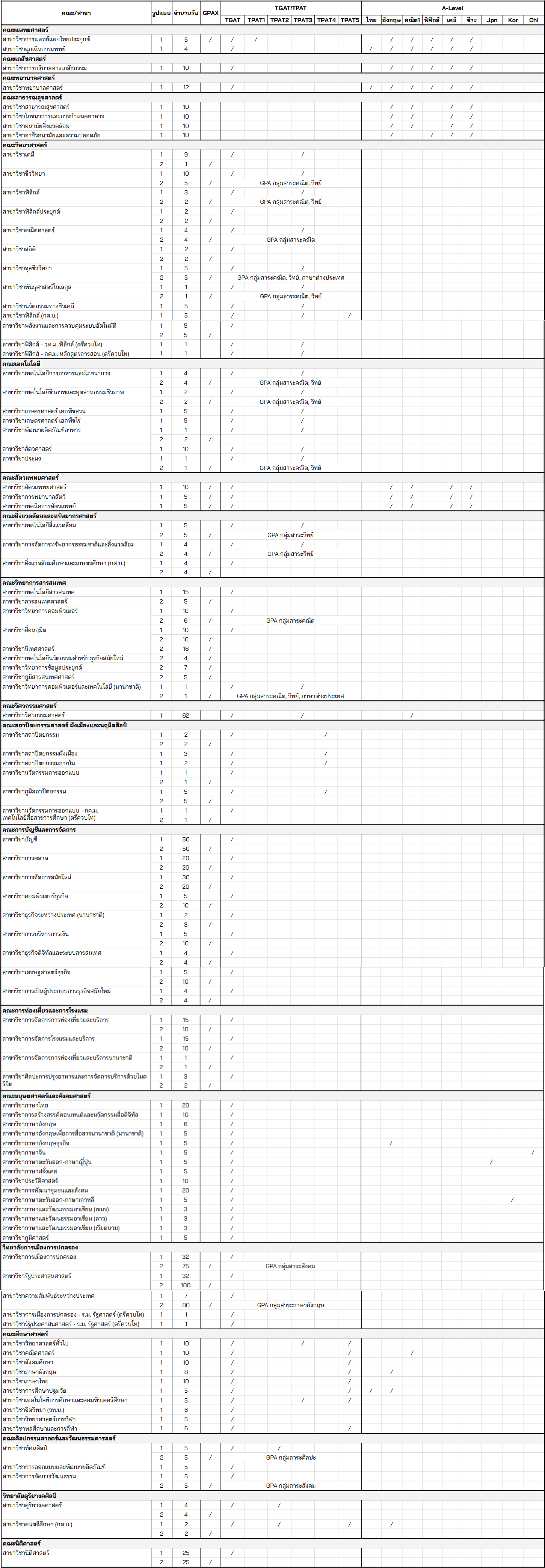 - รูปแบบที่ 1 : GPAX, TGAT/TPAT, A-Level : 94 สาขาวิชา 760 สาขาวิชา