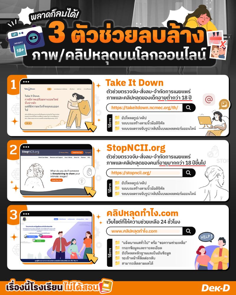 ข้อมูลจากhttps://takeitdown.ncmec.org/th https://stopncii.org/ www.คลิปหลุดทำไง.comhttps://www.facebook.com/unicefthailand/https://www.facebook.com/weareoja/