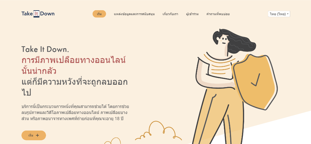 เว็บไซต์ https://takeitdown.ncmec.org/th/ เป็นบริการฟรีเพื่อ ช่วยเหลือเยาวชนและวัยรุ่นที่มีอายุต่ำกว่า 18 ปี ที่กังวลว่ามีรูปภาพหรือคลิปเปลือยของตัวเองหลุดอยู่บนโลกออนไลน์ สามารถแจ้งลบรูปภาพหรือคลิปเหล่านั้นออกจากอินเทอร์เน็ต โดยไม่จำเป็นต้องเปิดเผยชื่อ ตัวตน หรือข้อมูลส่วนตัว