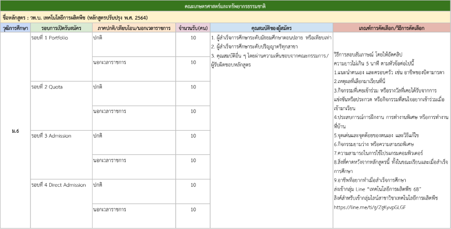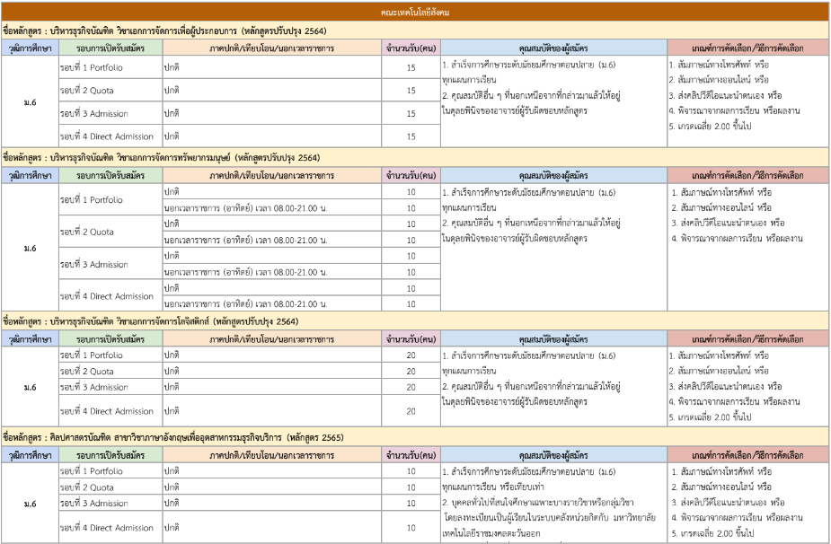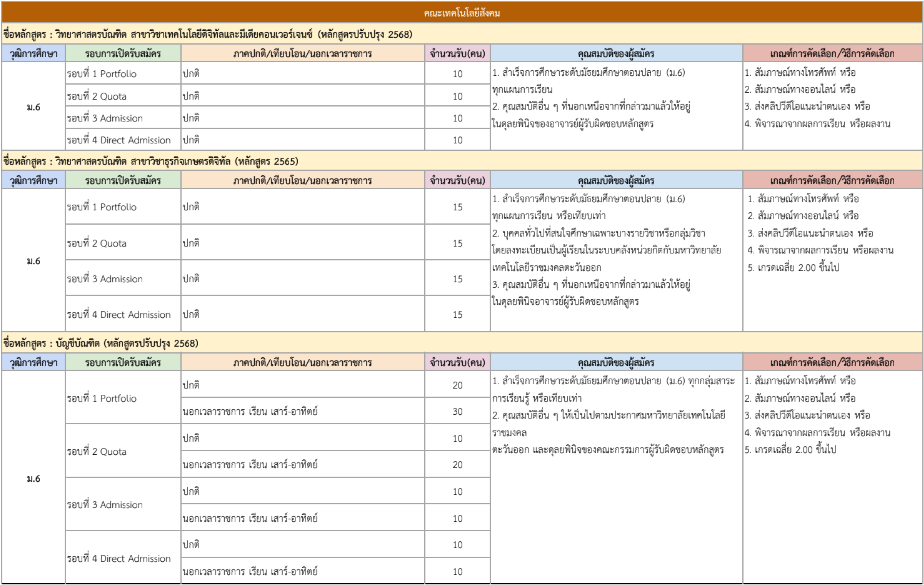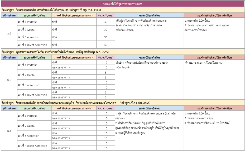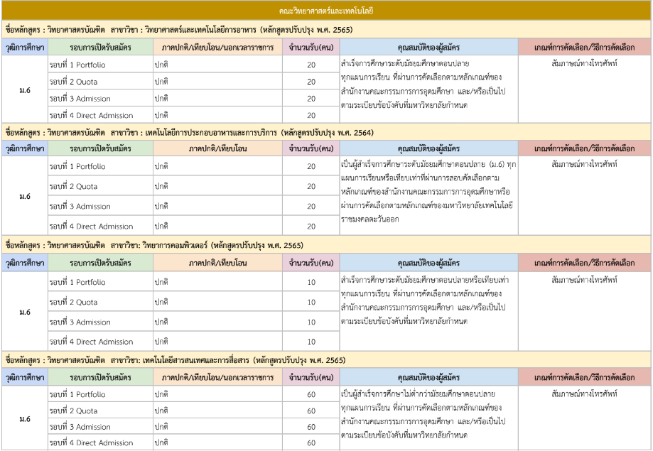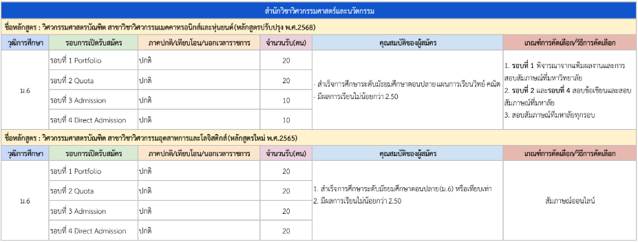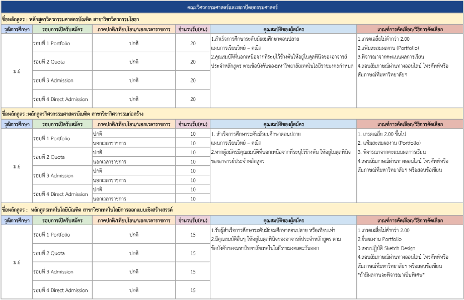 จากตารางข้างต้น มีแผนการรับแต่ละรอบให้น้องๆ ดูด้วย ดังนั้น ใครที่ยังไม่พร้อมเข้ารอบ Portfolio ก็สามารถดูรอบอื่นเป็นแนวทางได้เลย และสำหรับน้องๆ ที่เป็นวุฒิ ปวช. ก็มีโครงการเฉพาะเหมือนกัน ดูได้ที่ https://academic.rmutto.ac.th/?page_id=2396 หมดเขต 15 ธ.ค.นี้