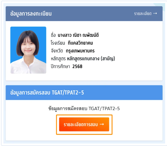 1. เข้าระบบที่ https://student.mytcas.com ระบบแสดงข้อมูลการสมัครสอบ TGAT/TPAT2-5 ที่ได้ทำการสมัครไว้ เลือก “ดูรายละเอียดการสอบ” ปุ่มสีส้มด้านท้าย