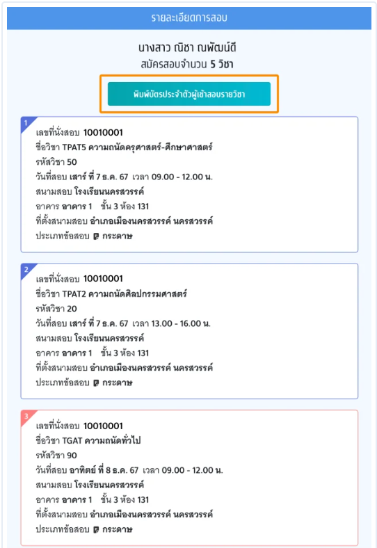 3. เมื่อกดรับทราบแล้ว ระบบจะแสดงข้อมูลการสมัครสอบทั้งหมดไว้ ควรตรวจสอบข้อมูลรายวิชาอีกครั้งเพื่อความถูกต้อง จากนั้นเลือก "พิมพ์บัตรประจำตัวผู้เข้าสอบรายวิชา" ที่ปุ่มสีฟ้า ใต้ชื่อและจำนวนวิชาที่สมัครสอบหรือที่ด้านท้ายของหน้าข้อมูล