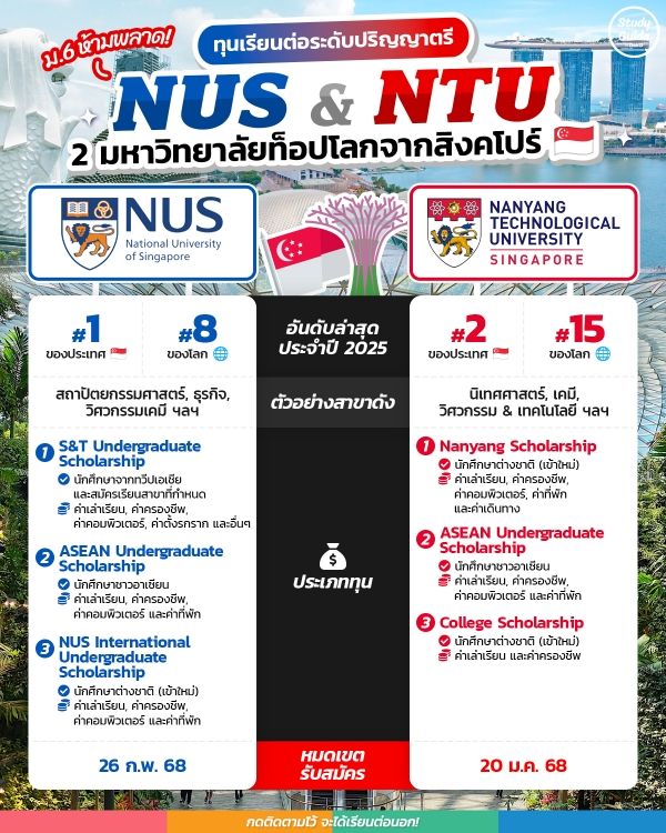 โอกาสสำหรับน้องๆ ที่อยากเรียนต่อสิงคโปร์มาแล้วค่ะ เพราะตอนนี้ 2 มหาวิทยาลัยชื่อดังระดับโลกอย่าง 'National University of Sinagppore' และ 'Nanyang Technological University' ได้เปิดรับสมัครนักศึกษาต่างชาติระดับปริญญาตรี สำหรับ 2025 Intake อยู่ในตอนนี้ ความดีงามคือมีทุนเต็มจำนวน ให้คนที่มีผลการเรียนดีด้วย! // ใครอยากเรียนใกล้ไทย แถมได้คุณภาพการศึกษาระดับ World Class รีบตาม Study Guide by Dek-D มาเช็กรายละเอียดกันเลยย~