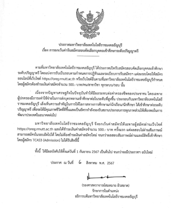 ข่าวดี! สอบไม่ติด รอบ Portfolio-Quota มทร.ธัญบุรี สมัครรอบถัดไปไม่คิดเงิน