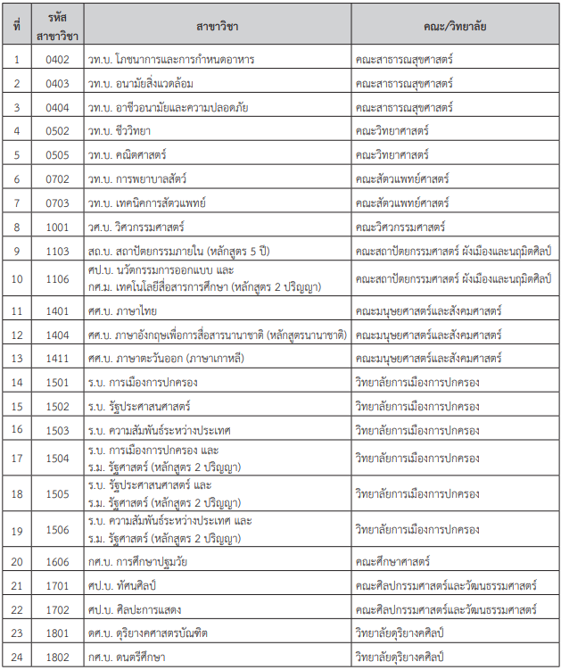 - สาขาวิชาภาษาตะวันออก (ภาษาเกาหลี) 20 ที่นั่ง