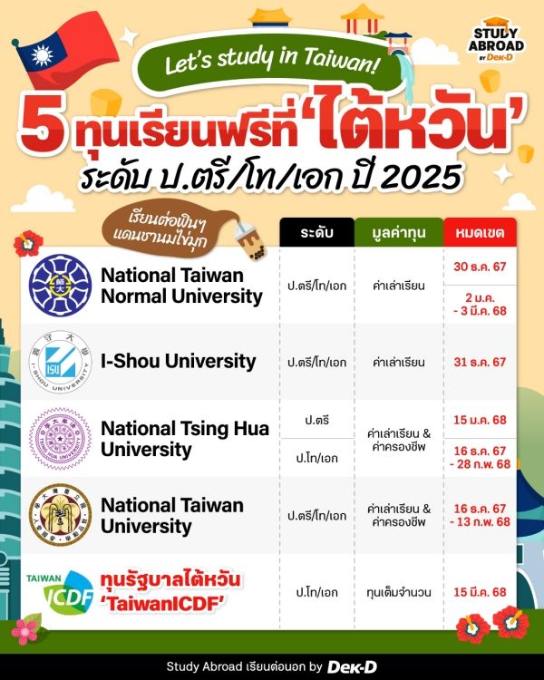 ใครอยากคว้าโอกาสดีๆ เพื่อไปเรียนต่อฟินๆ พร้อมเช็กอิน Taipei 101 รีบตามมาเช็กลิกต์ 5 ทุนสุดปังที่ทาง Study Abroad by Dek-D ได้สรุปมาให้กันเลยค่ะ~ // P.S. บางทุนใกล้ปิดรับสมัครแล้ว!!