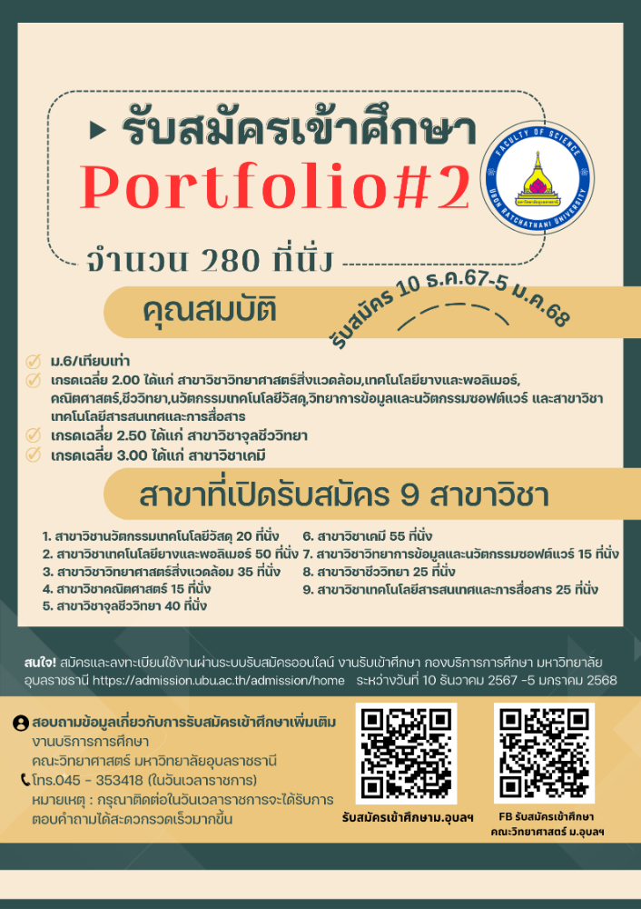 มหาวิทยาลัยอุบลราชธานี กำลังเปิดรับสมัครรอบ Portfolio ครั้งที่ 2 ซึ่งคณะวิทยาศาสตร์เปิดรับถึง 9 สาขาวิชา กว่า 280 ที่นั่ง ขอบอกว่าใกล้ปิดรับสมัครแล้ว ไม่อยากพลาดโอกาสดีๆ แบบนี้ เตรียมเอกสารการสมัครให้พร้อม แล้วเตรียมตัวไปเป็นน้องใหม่ ม.อุบลฯ กัน