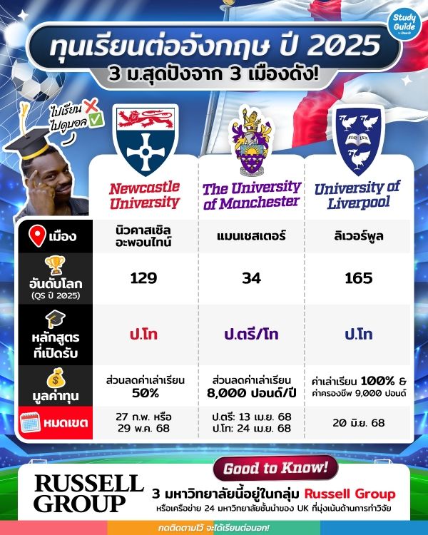 ใครเป็นคอลูกหนังที่อยากสานฝันไปเรียนต่อประเทศอังกฤษในปี 2025 ตอนนี้มีโอกาสสุดปังจาก 3 มหาวิทยาลัยดังในกลุ่ม Russell Group มาแล้วค่ะ! นอกจากจะเปิดรับสมัครเรียนต่อแล้ว แต่ละยูก็มีทุนพร้อม support ให้นักศึกษาชาวไทยด้วย มาครบทั้ง #ทีมนิวคาสเซิล #ทีมแมสเชสเตอร์ หรือว่า #ทีมลิเวอร์พูล ใครเป็นสาวกทีมไหน รีบตามไปเช็กข้อมูลกับ Study Guide by Dek-D กันเลยค่าา~