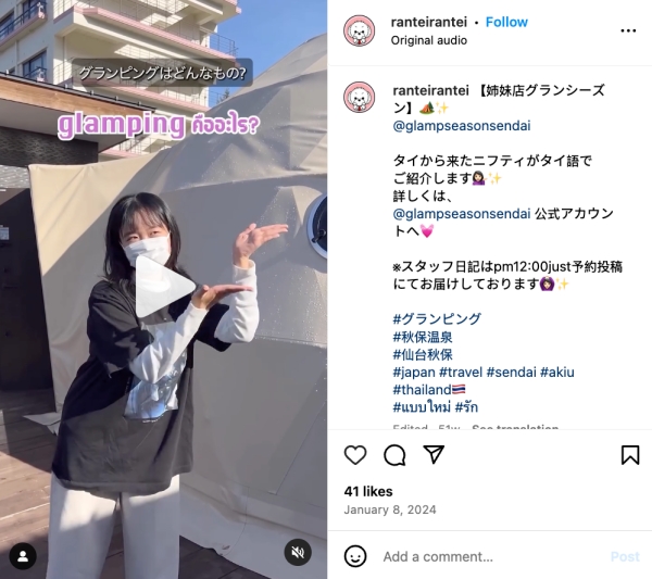 หนูได้มาทำงาน Content Marketing ให้โรงแรม Oshu Akiu Onsen Rantei เป็นออนเซนกึ่งแกลมปิ้ง (Glamping)* ตั้งอยู่ที่ย่านอาคิอุ* (Akiu: 秋保町) จังหวัดมิยางิ (Miyagi:宮城) ส่วนใหญ่แขกที่เข้าพักเป็นคนญี่ปุ่น เน้นแนวครอบครัวและคนรักสัตว์ค่ะ ในเมืองนี้จะเป็นที่เที่ยวแนวธรรมชาติ ถ้าเทียบกับบ้านเราน่าจะเป็นฟีลเขาใหญ่ มีบ้านคนเล็กๆ คาเฟ่ ตลาดใกล้โรงแรม หมู่บ้านวัฒนธรรมต่างๆ และก็เป็นย่านที่มีโรงแรมแนวออนเซนเยอะ