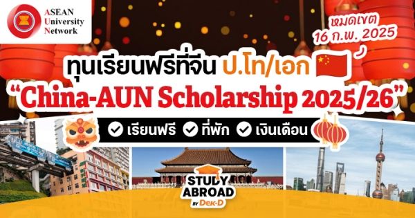 你好! ปีนี้มีชาว Dek-D คนไหนกำลังวางแผนเรียนต่อ ป.โท หรือ ป.เอก ที่ประเทศจีนบ้างไหมคะ? วันนี้เรามีข่าวมาอัปเดตว่าโครงการทุนสุดปังจากรัฐบาลจีนอย่าง ‘China-AUN Scholarship’ ประจำปี 2025/2026 ซึ่งกำลังเปิดรับสมัครถึงวันที่ 16 ก.พ.นี้ โดยเป็นทุนที่มอบโควตาให้ชาวอาเซียนโดยเฉพาะ ที่สำคัญเป็นทุนเต็มจำนวนตลอดหลักสูตรอีกด้วย อย่ารอช้ารีบไปเช็กรายละเอียดกันเลยค่ะ!