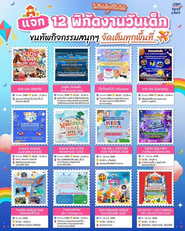 เด็กเอ๋ย เด็กดี~ ใกล้เข้ามาแล้วกับเทศกาล #วันเด็กแห่งชาติ ถ้าใครยังไม่รู้จะพาเด็กๆ ไปเช็กอินที่ไหนดี วันนี้ One Next Class #ชีวิตติดเรียนรู้ ขออาสาพาไปเปิดวาร์ป 12 พิกัดอิเวนต์งานวันเด็กทั่วกรุงเทพฯ รวมถึงพื้นที่ใกล้เคียง ที่พร้อมขนทัพกิจกรรมแน่นๆ มาให้เข้าร่วมสนุกตั้งแต่เช้าจรดเย็น จะมีที่ไหนจัดใกล้เราบ้าง ตามมาเช็กลิสต์กันไว้เลย~