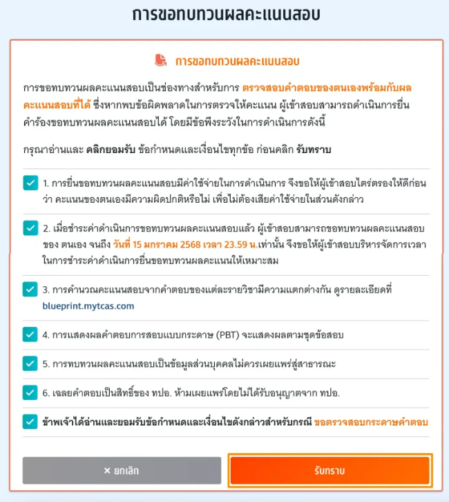 5. หากตรวจเช็กแล้วว่ามีข้อผิดพลาดในการตรวจคะแนน สามารถยื่นคำร้องขอทบทวนคะแนนได้เลย ภายในวันที่ 15 มกราคม 2568