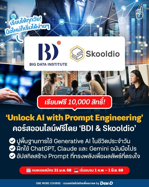 เสิร์ฟข่าวดีต้อนรับปีใหม่! วัยเรียน & วัยทำงานที่อยากเรียนรู้การใช้ Generartive AI โดยเฉพาะเครื่องมือมาแรงอย่าง ChatGPT, Claude และ Gemini รวมถึงเทคนิคการป้อน Prompt Engineering ที่จะช่วยเพิ่มประสิทธิภาพการตอบสนองของ AI ห้ามพลาดโอกาสนี้ เพราะทาง BDI - Big Data Institute หรือ สถาบันข้อมูลขนาดใหญ่ (องค์การมหาชน) ร่วมกับบริษัท สคูลดิโอ จำกัด (Skooldio) กำลังแจกสิทธิ์ลงทะเบียนเรียนฟรีกว่า 10,000 ที่นั่ง!