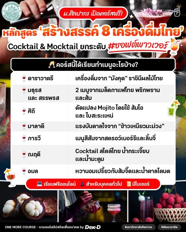 ทุกคนรู้ ทั้งโลกรู้ ผลไม้ไทยอร่อยที่สุด! วันนี้ One More Course มีคอร์สออนไลน์ #เรียนฟรี เนื้อหาใหม่แถมน่าสนใจมากๆ ส่งตรงจาก #มหาวิทยาลัยศิลปากร มาเปิดวาร์ปให้ตามไปเรียนกัน กับหลักสูตร “Creative Power of Thai Drinks - พลังแห่งความสร้างสรรค์ในเครื่องดื่มไทย” พาทุกคนไปเปิดประสบการณ์ใหม่ๆ ในการครีเอต 8 เมนูเครื่องดื่ม Cocktail และ Mocktail จากผลไม้ไทยให้โดดเด่นและแตกต่าง พร้อมแชร์เทคนิคลับๆ ไม่ซับซ้อน แม้ว่าจะเป็นมือใหม่ก็ทำตามได้ง่ายๆ จนสามารถต่อยอดเป็นอาชีพได้ด้วย