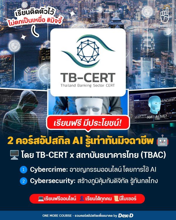 วันนี้ One More Course จึงแวะมาแนะนำคอร์สฟรีจาก TB-CERT ร่วมกับสถาบันธนาคารไทย (TBAC) ที่จะทำให้ทุกคน “รู้เท่าทันเกมของมิจฉาชีพ” มีให้เรียนถึง 2 คอร์สด้วยกัน รับรองว่าเรียนแล้วมีภูมิคุ้มกันทางดิจิทัลแน่นอน!