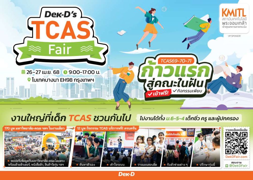 ส่วนใครที่กำลังมองหาตัวช่วยพิชิตคณะในฝันก็แวะมาเจอกันได้ที่งานแฟร์การศึกษาครั้งใหญ่ประจำปี “Dek-D’s TCAS Fair” น้องๆ ม.ปลาย และผู้ปกครองสามารถพากันไปฟังแนะแนวฟรี! จากทีมงานเด็กดี, เหล่ารุ่นพี่ และจากคณะ/มหาวิทยาลัย/ติวเตอร์โดยตรง งานเดียวจบครบทุกเรื่อง TCAS ทั้งได้ค้นหาคณะที่เหมาะกับเราที่สุด ได้รับตัวช่วย พร้อมคำปรึกษา TCAS ทั้งรอบพอร์ต และรอบสอบ งานนี้มีเกียรติบัตรให้ฟรี! สำหรับผู้ที่เข้าร่วมกิจกรรมครบตามที่กำหนด
