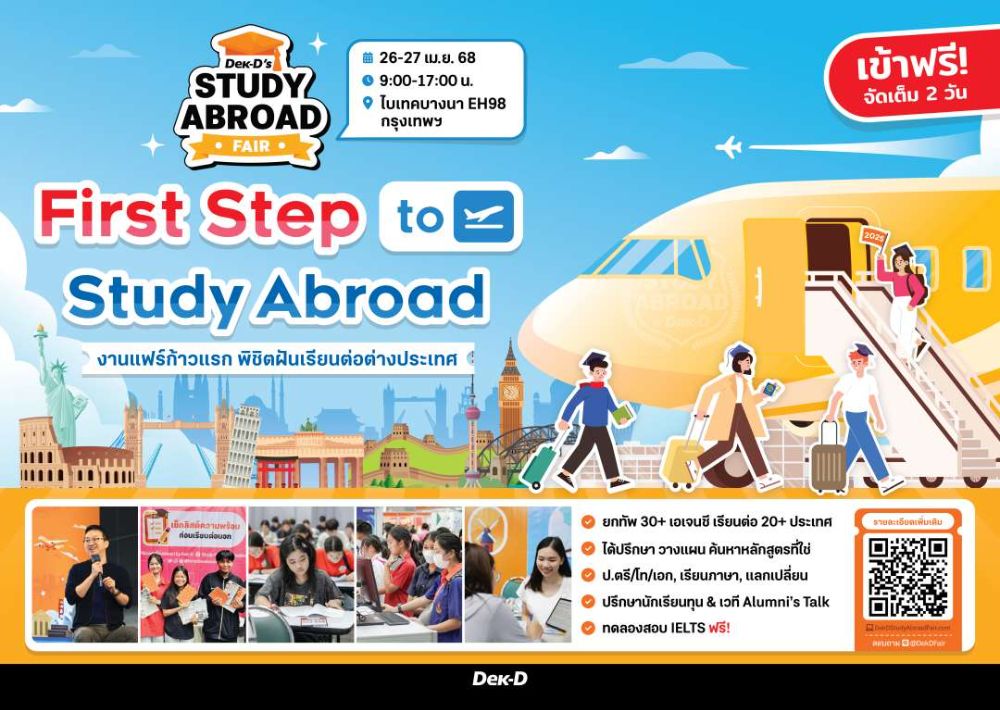 แต่ไม่ได้มีแค่งานเดียวเท่านั้น #ทีมเด็กนอก ห้ามพลาด! งานแฟร์เรียนต่อต่างประเทศครั้งใหญ่ “Dek-D’s Study Abroad Fair” อีเวนต์สุดครบเครื่องต้อนรับเทศกาลสมัครเรียนต่อนอกปี 2025 ใครอยากเรียนต่อต่างประเทศ แต่ไม่รู้ต้องเริ่มยังไง? หาข้อมูลเองแล้วแต่ก็ยังไม่ได้คำตอบที่ตรงใจ มางานนี้จะได้คุย ได้ปรึกษา ได้รับข้อมูล ได้เปรียบเทียบ เพื่อประกอบการตัดสินใจให้ง่ายกว่าเดิม บอกเลยว่าเสิร์ฟข้อมูลแบบไม่มีกั๊ก!