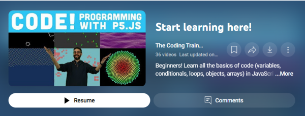 ขบวนถัดมาเป็นเพลย์ลิสต์ที่อัดแน่นวิดีโอสอนมาถึง 36 คลิป ให้เลือกเรียนกันอย่างจุใจเลย โดยเนื้อหาจะมุ่งเน้นไปที่เรื่องพื้นฐานการเขียนโปรแกรมคอมพิวเตอร์ โดยใช้ JavaScript ด้วย p5.js ซึ่งออกแบบมาเพื่อผู้เริ่มต้นเขียนโค้ดกันเลย โดยจะสอนตั้งแต่วิธีการเริ่มเขียน การแก้ปัญหา และการอัปโหลด //ถ้าผ่านขบวนนี้ไปได้ ขบนถัดๆ ไปก็คงง่ายขึ้นแล้ว!
