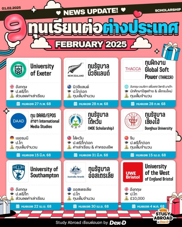 ปีนี้ใครที่กำลังวางแผนเรียนต่อเพื่อเพิ่มโอกาสใหม่ๆ ให้ตัวเอง วันนี้ Study Abroad by Dek-D ขอแวะมาอัปเดตข่าว 9 ทุนเรียนต่อต่างประเทศที่กำลังเปิดรับสมัครในเดือนกุมภาพันธ์นี้ บอกเลยว่าแต่ละทุนน่าสนใจมากๆ มีทั้งระดับปริญญาตรี ปริญญาโท ฝึกงานต่างประเทศ ตามมาเช็กรายละเอียดกันต่อได้เลย~