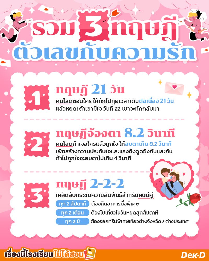 ข้อมูลจาก https://www.dek-d.com/education/52055https://www.dek-d.com/loveroom/50939/https://www.dek-d.com/loveroom/59470/เรื่องยากๆ ของความรักเรารวมฮิตมาให้หมดแล้ว วาเลนไทน์นี้เอาไปใช้ไม่ทันไม่เป็นใคร ถ้าเจอคนที่ใช่ อย่าลืมหยิบเอาทฤษฎีนี้ไปใช้ ผลลัพธ์เป็นยังไง? มารีวิวกันด้วยนะคะ
