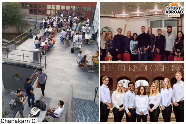 - นอกคลาสมีกิจกรรมแนววิชาการให้เข้าร่วม เช่น ปีแรกฝนได้เข้าร่วม Fiberteknologerna ซึ่งรวมตัวคนที่สนใจเรื่อง Natural Product, Cellulose และ Fiber มาเรียนรู้ด้วยกัน มีจัดทริปพาไปดูการทำงานจริงในอุตสาหกรรม เช่น พาไปดูโรงงานและบริษัทอุตสาหกรรมที่ทำเกี่ยวกับ ไฟเบอร์โดยเฉพาะ ไปดูโรงงานการผลิตไฟเบอร์ต่างๆ ตอนนั้นมีโอกาสลองขึ้นรถเครนที่ใช้ตัดต้นไม้เพื่อนำมาทำกระดาษ ได้ลองขึ้นกระดาษเองเป็นแผ่นเล็กๆ ด้วยค่ะ