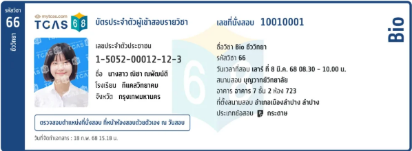 1 บัตรประจำตัวผู้เข้าสอบรายวิชา รายวิชาละ 1 ใบ พิมพ์ได้ทั้งสีและขาวดำ ที่เว็บ student.mytcas.com หรือบันทึกใส่โทรศัพท์ และแสดงบัตรประจำตัวผู้เข้าสอบจากหน้าจอโทรศัพท์ก็ได้ ทั้งนี้ใครเอาโทรศัพท์ไป ต้องหาที่เก็บเองนะ เพราะเอาเข้าห้องสอบไม่ได้