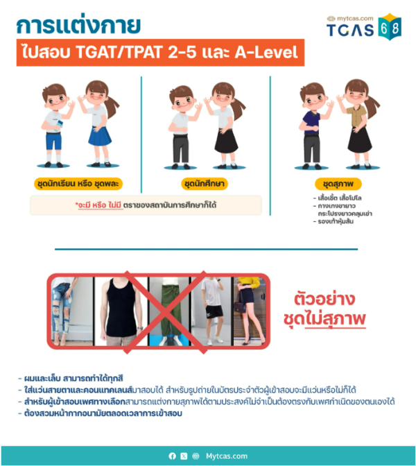 สำหรับการแต่งกาย ทปอ. ค่อนข้างยืดหยุ่นมาก สามารถใส่ได้ทั้งชุดนักเรียน ชุดพละ ชุดสุภาพทั่วไป รองเท้าผ้าใบ ทำสีผม ทำเล็บได้ ใส่แว่นได้ ดังนั้นขอแค่น้องๆ เลี่ยงการแต่งกายที่ไม่สุภาพ เช่น เสื้อแขนกุด กางเกงขาสั้น กระโปรงสั้น ฯลฯ เท่านี้ก็สามารถเข้าสอบได้แล้ว
