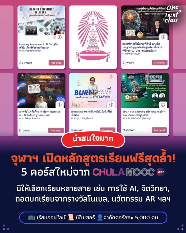 Chula MOOC Snap กลับมาแล้ว! รอบนี้จุฬาฯ มาพร้อมกับ 5 คอร์สใหม่เรียนฟรี #มีใบเซอร์ ยกทัพผู้เชี่ยวชาญมาเสิร์ฟความรู้กับหลักสูตรสุดล้ำ อัปสกิลกันฉ่ำๆ ไม่ว่าจะเป็น #คอร์สสายวิทย์ไอที การเลือกใช้ AI อย่างสร้างสรรค์, นวัตกรรม AR สู่การศึกษาสัตวแพทย์ยุคดิจิทัล, ปัญญาประดิษฐ์ยุคใหม่ที่ผสานฟิสิกส์และ AI, ถอดรหัสโปรตีนด้วย AI รวมไปถึง #คอร์สฮีลใจ เติมพลังใจ ในวันที่ไฟเริ่มมอด ใครที่กำลังอยู่ในภาวะ burnout แวะมาจดคำแนะนำดีๆ จากนักจิตวิทยาไปปรับใช้กันได้นะ