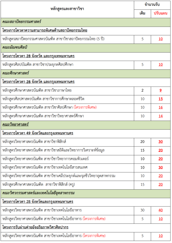 - คณะสถาปัตยกรรมศาสตร์ เพิ่มจาก 25 เป็น 30 ที่นั่ง