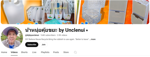 ช่องนี้เรียกได้ว่าเป็นมือโปรทางด้านบรรจุภัณฑ์พลาสติกเลยทีเดียว ไม่ว่าจะเป็นขวดน้ำเปล่า น้ำอัดลม แก้วน้ำ แกลลอนนม หรือตะกร้าขนมจีน ก็สามารถนำมา DIY เป็นของใช้ในบ้านชิ้นใหม่ได้หมด โดย ‘น้าหนุ่ย’ ได้ถือคติที่ว่า “เอามารีไซเคิล ดีกว่าทิ้งไปเปล่าๆ” ทำให้ทุกอย่างที่มีถูกใช้อย่างคุ้มค่าที่สุด โดยไม่มองข้ามเลยสักชิ้นเดียว!