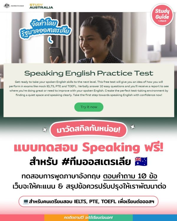 วันนี้ พี่วุฒิ เลยขอมาเปิดวาร์ป “Speaking English Practice Test” แบบทดสอบการพูดภาษาอังกฤษฟรี จัดทำโดยรัฐบาลออสเตรเลีย ซึ่งเค้าจะมีคำถามให้เราตอบ 10 ข้อ เช่น ทำไมอยากเรียนต่อออสเตรเลีย? อยากเรียนต่อสาขาอะไร? คุณมีการวางแผนหลังเรียนจบเอาไว้ยังไงบ้าง? เป็นต้น