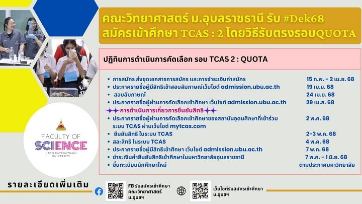 รีบเลย! TCAS68 โควตาคณะวิทยาศาสตร์ ม.อุบลราชธานี ปิดรับสมัคร 2 เม.ย.นี้ รวมกว่า 310 ที่นั่ง