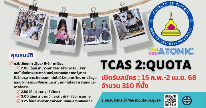 ใครยังรอสมัคร TCAS68 รอบ 2 Quota อยู่ พี่มิ้นท์มีอีกหนึ่งคณะมาแนะนำ กำลังเปิดรับสมัคร นั่นคือ โควตาคณะวิทยาศาสตร์ ม.อุบลราชธานี เปิดรับกว่า 310 ที่นั่ง จาก 11 สาขาวิชาที่น่าเรียนมากในตอนนี้ โดยจะรับไปจนถึงวันที่ 2 เมษายนนี้ ไปดูรายละเอียดกันเลย