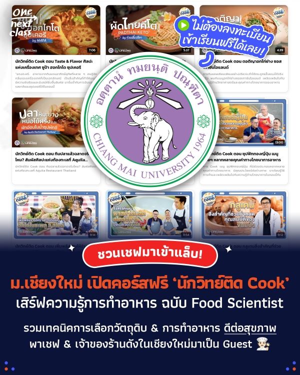 ถึงเวลาเข้าแล็บแล้วนะคะเชฟ! วันนี้ One Next Class #ชีวิตติดเรียนรู้ จะชวน #สายกิน ไปตักวัตถุดิบความรู้เน้นๆ ไว้รังสรรค์ให้ทุกเมนูของเราอุดมด้วยคุณภาพกว่าที่เคย เพราะล่าสุด “มหาวิทยาลัยเชียงใหม่” ได้เปิดห้องเรียนออนไลน์ สายอาหารและโภชนาการ & การเรียนรู้วิทยาศาสตร์ ให้ทุกคนเรียนฟรีแบบไม่อั้น เสิร์ฟความรู้และทริกส่งตรงจากผู้เชี่ยวชาญทางด้านอาหารตัวจริง