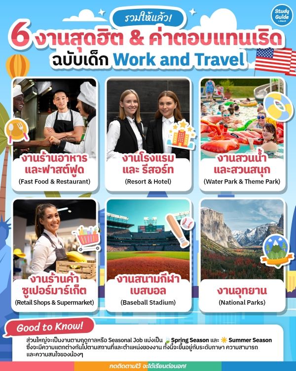 สวัสดีน้องๆ ชาว Dek-D ทุกคนค่า ไหนมีใครวางแผนอยากไป Work and Travel USA บ้างยกมือขึ้นน แน่นอนว่าหนึ่งในขั้นตอนที่สำคัญที่สุดในการการสมัครโครงการนี้จะเป็นอะไรไปไม่ได้เลยนอกจาก ‘การเลือกงาน’ เพราะหน้าที่หลักของเราก็คือการไปทำงานใช่ไหมล่ะคะ การได้งานที่เหมาะกับตัวเองจึงเป็นเรื่องที่สำคัญมาก หากเราเลือกงานที่ตรงกับความสามารถ ความสนใจ และระดับภาษาของเรา ไม่เพียงแต่จะช่วยให้เราปรับตัวได้ง่ายขึ้น แต่ยังทำให้เราสนุกและเอนจอยกับการทำงานตลอดระยะเวลา 3 เดือนหรือจนจบโครงการอีกด้วย