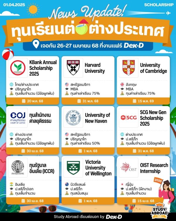 รวมมาให้แล้ว! 9 ทุนเรียนต่อต่างประเทศที่กำลังเปิดรับสมัครกันแบบฉ่ำๆ ในช่วงซัมเมอร์นี้ บอกเลยว่ามีแต่ทุนใหญ่ๆ ปังๆ ทั้งจากมหาวิทยาลัยชื่อดังและองค์กรชั้นนำระดับประเทศ ใครที่ไม่อยากพลาดโอกาสดีๆ แบบนี้ รีบตามไปเช็กรายละเอียดกันเลย~