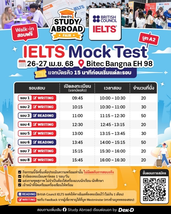 - จำกัดที่นั่ง ลงทะเบียนทาง Walk-in 100% ก่อนเริ่มสอบ 15 นาทีของแต่ละรอบเท่านั้น