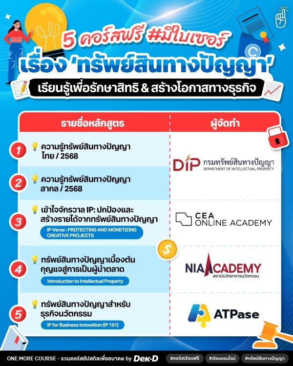 ในยุคที่ใครๆ ก็สามารถแสดงความคิดสร้างสรรค์ได้อย่างเปิดกว้างและง่ายดาย การเข้าใจ “ทรัพย์สินทางปัญญา” จึงเป็นเรื่องสำคัญที่ทุกคนควรรู้ เพราะไม่ใช่เพียงช่วยปกป้องผลงานจากการถูกละเมิด แต่ยังเป็นกุญแจสำคัญในการต่อยอดไอเดียและสร้างโอกาสทางธุรกิจอีกด้วย วันนี้ One More Course จึงรวบรวมคอร์สเรียนฟรี #มีใบเซอร์ จาก 4 แหล่งการเรียนรู้ พร้อมสรุปรายละเอียดมาให้แล้ว // จะมีคอร์สไหนน่าเรียนบ้าง รีบตามไปเช็กรายละเอียดเลย~