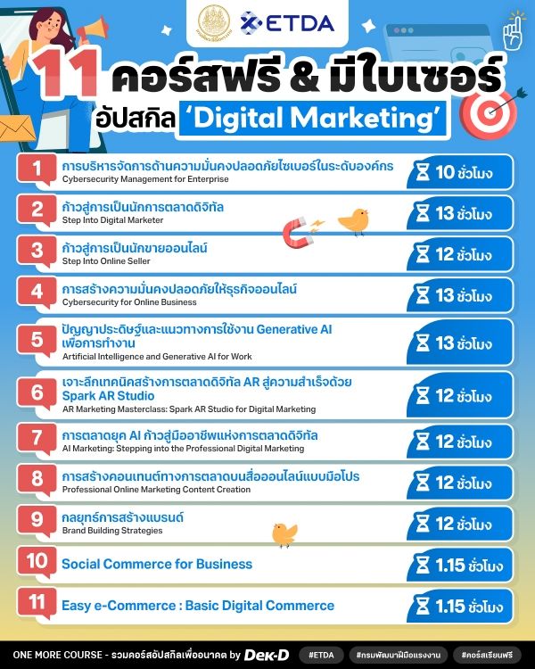 ในยุคที่ดิจิทัลเข้ามามีบทบาทกับธุรกิจแบบเต็มรูปแบบ #ทีมการตลาด คนไหนที่ยังไม่มีสกิล Digital Marketing อาจตกขบวนและทำให้พลาดโอกาสทางธุรกิจได้นะ! วันนี้ One More Course ขอมาเปิดวาร์ป 11 คอร์สออนไลน์เรียนฟรี “หลักสูตรพัฒนาทักษะด้านดิจิทัล” ซึ่งเป็นการร่วมมือกันระหว่าง กรมพัฒนาฝีมือแรงงาน (DSD) และ สำนักงานพัฒนาธุรกรรมทางอิเล็กทรอนิกส์ (ETDA) มาให้ทุกคนได้ตามไปเรียนกันแบบไม่มีกั๊ก!