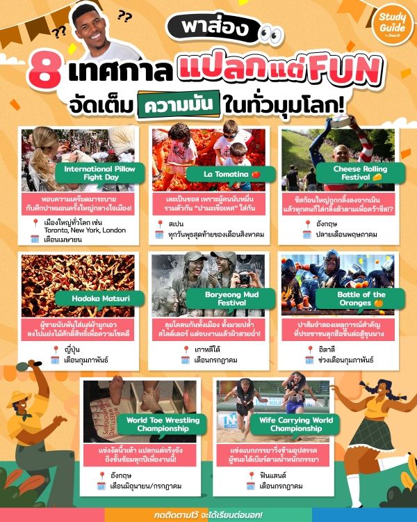 แหล่งที่มาข้อมูลhttps://www.awarenessdays.com/awareness-days-calendar/international-pillow-fight-day-2025/https://www.latomatinatours.com/https://www.soglos.com/event/outdoors/gloucestershire-cheese-rolling/17943/https://en.japantravel.com/okayama/naked-man-festival/1475https://english.visitkorea.or.kr/svc/contents/contentsView.do?vcontsId=96386https://www.visititaly.eu/places-and-tours/historic-ivrea-carnival-battle-of-orangeshttps://www.bbc.com/news/articles/cp8n5qqm456ohttps://vinepair.com/articles/finland-wife-carrying-competition-beer-prize/