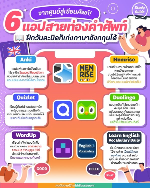 - ใช้ระบบ Spaced Repetition (ทบทวนแบบเว้นระยะ) ช่วยให้จำคำศัพท์ระยะยาว