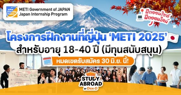 こんにちは ชาว Dek-D ทุกคนค่า~ สำหรับใครที่กำลังมองหาโอกาสไปเปิดประสบการณ์ใหม่ๆ หรือลองฝึกงานสไตล์ญี่ปุ่น พี่ลูกหมูขอแนะนำโครงการนี้เลยค่ะ “METI Japan Internship Program” ประจำปี 2025 เรียกว่าเป็นอีกโปรแกรมที่หลายคนสนใจในทุกๆ ปี เพราะว่าหลังฝึกเสร็จแล้วก็อาจมีสิทธิ์ได้ลุ้น offer จ้างงานต่ออีกด้วย (ดีมากกก) สำหรับรายละเอียดของปีนี้จะเป็นยังไง ใครสมัครได้บ้าง? และมีทุนสนับสนุนแค่ไหน? รีบเลื่อนไปเช็กข้อมูลที่เราสรุปไว้กันเลยค่า~