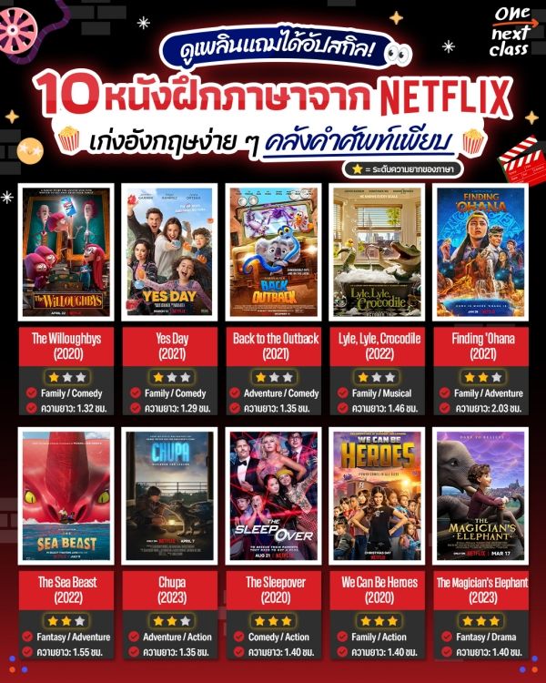 It's time to improve your English. ใครเบื่อๆ ไม่รู้จะทำอะไร มาฝึกภาษาอังกฤษสนุกๆ จากหนังบน Netflix กันหน่อยมั้ย? วันนี้ One Next Class #ชีวิตติดเรียนรู้ ได้ลิสต์หนัง 10 เรื่องที่คัดมาแล้วว่าดูง่าย ไม่เครียด เหมาะกับการฝึกภาษาอังกฤษทุกระดับมาให้แล้ว ใครอยากฝึกภาษาให้เป็นแบบธรรมชาติเหมือน Native Speakers รีบเซฟเก็บไว้ดูกันเลย~