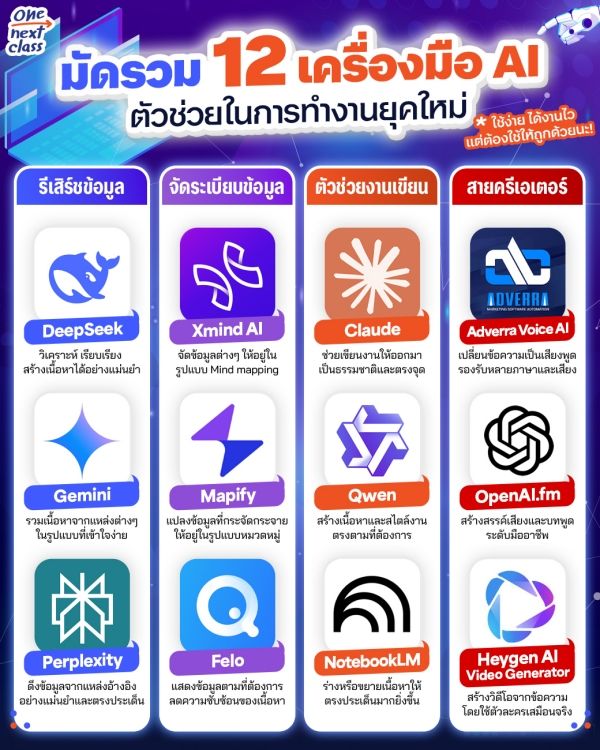 งานเร่ง งานด่วน งานเยอะแบบนี้ เชื่อว่าหลายคนหันมาใช้เครื่องมือ AI เพื่อช่วยทุ่นเวลากันมากขึ้น วันนี้ One Next Class #ชีวิตติดเรียนรู้ จึงมัดรวม 12 เครื่องมือ AI ที่คิดว่ามีประโยชน์มาฝากทุกคนให้ลองไปใช้กัน โดยแบ่งออกเป็น 4 หมวดหมู่หลักๆ ตอบโจทย์การใช้งานทุกสาย! // บอกเลยว่าแต่ละตัวใช้งานง่าย ไม่ซับซ้อนแน่นอน~