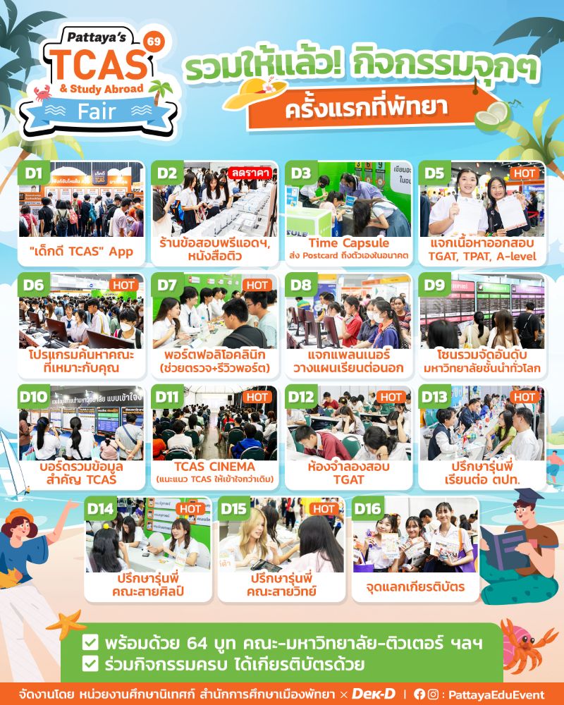- งานเดียวครบ! ยกทัพ 90 บูทจากคณะ มหา'ลัยไทย สถาบันติวสอบ เอเจนซีผู้เชี่ยวชาญด้านการเรียนต่อ เสริมด้วยกิจกรรมหลากหลายสีสัน ที่รอให้ทุกคนมาเปิดประสบการณ์ใหม่ๆ ไปด้วยกัน ทั้งจากประเทศอังกฤษ สหรัฐอเมริกา ออสเตรเลีย เยอรมนี ฟินแลนด์ สิงคโปร์ จีน ญี่ปุ่น ไต้หวัน และอีกมากมาย
