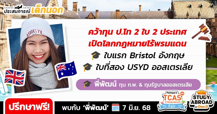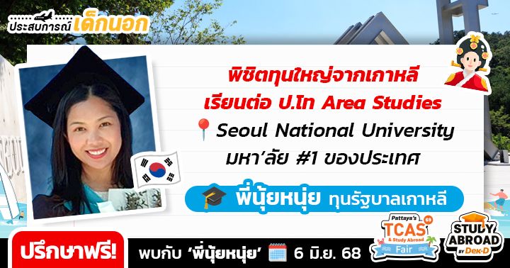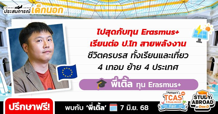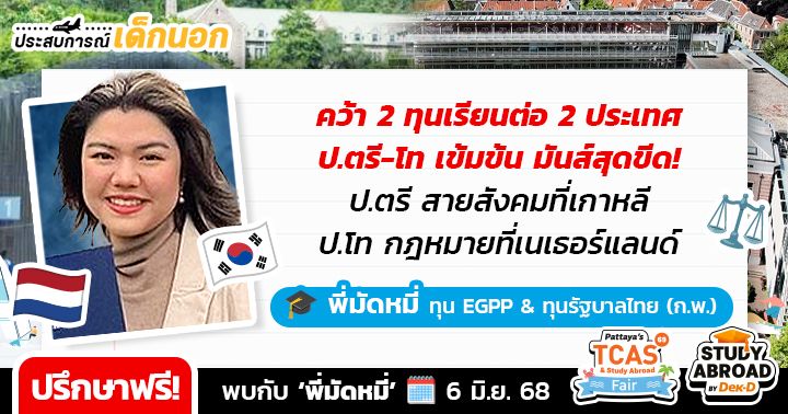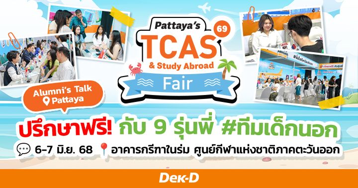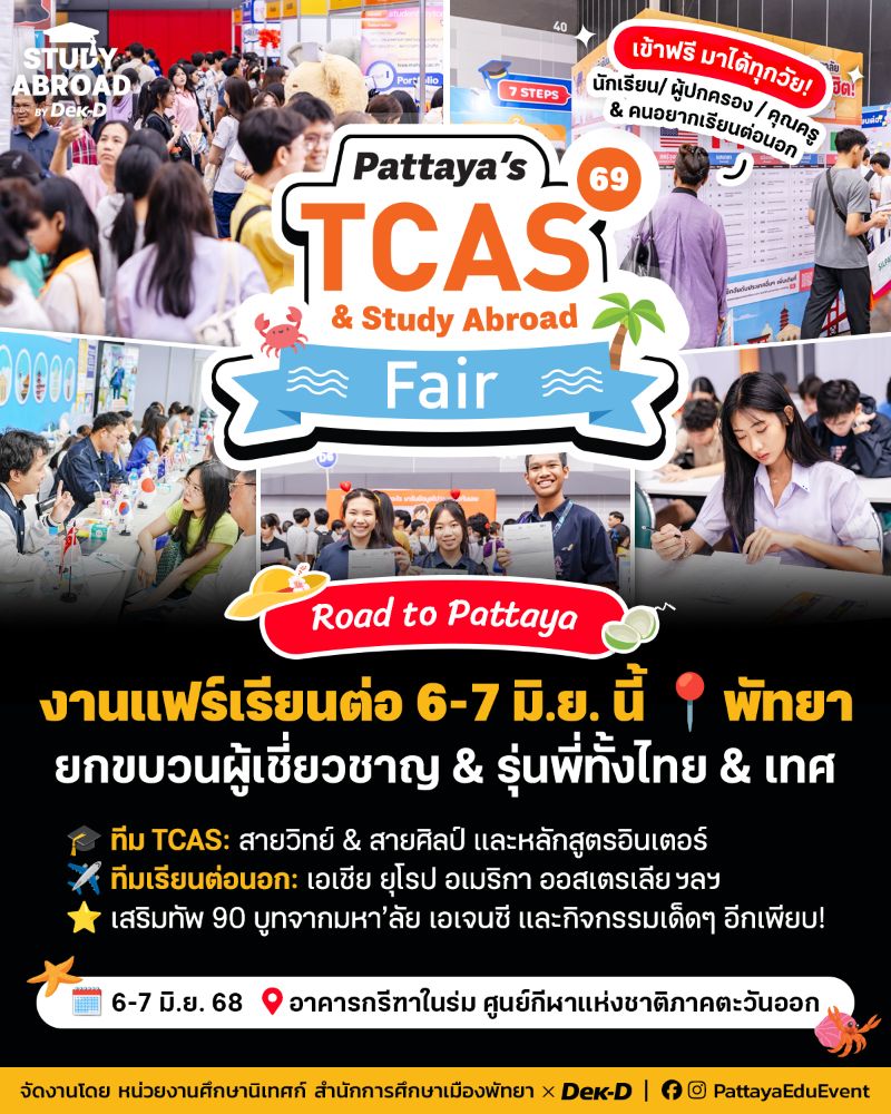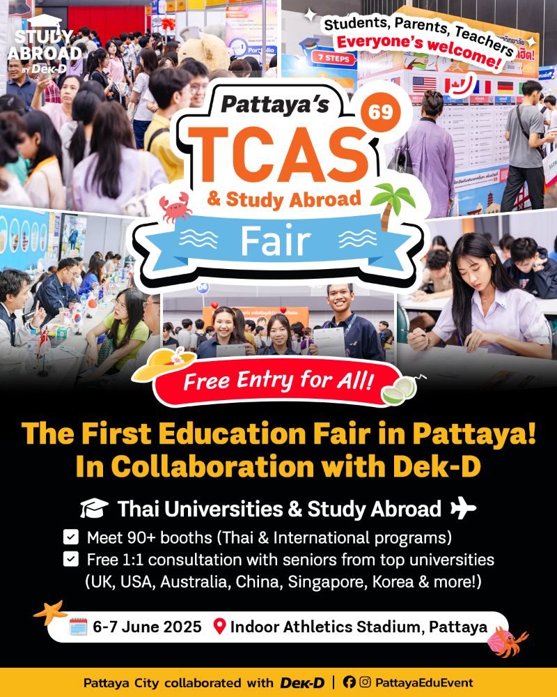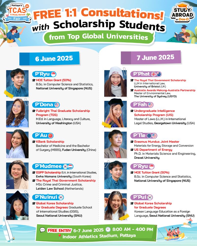 ใครอยากคว้าทุนเรียนต่อต่างประเทศ เตรียมตัว walk-in ปรึกษาฟรี กับ 9 รุ่นพี่นักเรียนทุนดีกรีสุดปังจาก Top Global Universities หลากหลายประเทศ ที่ยกขบวนมาให้คำแนะนำในการสมัครเรียน & วางแผนพิชิตทุนแบบ one-on-one ในงาน Pattaya’s TCAS & Study Abroad Fair 2025 มหกรรมการศึกษาต่อและเปิดประตู่สู่มหาวิทยาลัย TCAS69