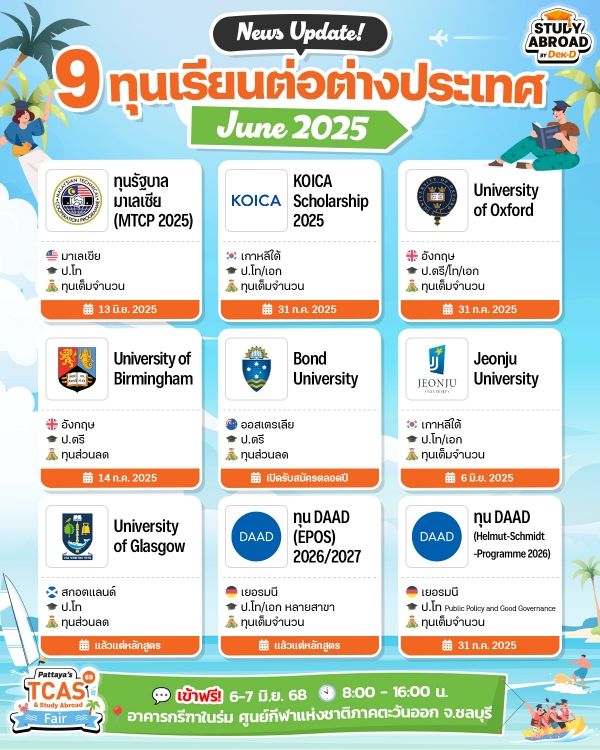 เผลอแปบเดียวก็เดินทางมาถึงกลางปี 2025 กันแล้ว ซึ่งช่วงนี้ก็มีทุนเรียนต่อต่างประเทศเปิดรับสมัครกันรัวๆ ทั้งระดับ ป.ตรี โท และเอก จากหลายมหา'ลัย หลายประเทศ จะมีทุนอะไรบ้าง รีบตาม Study Abroad by Dek-D มาเช็กรายละเอียดกันเลย~