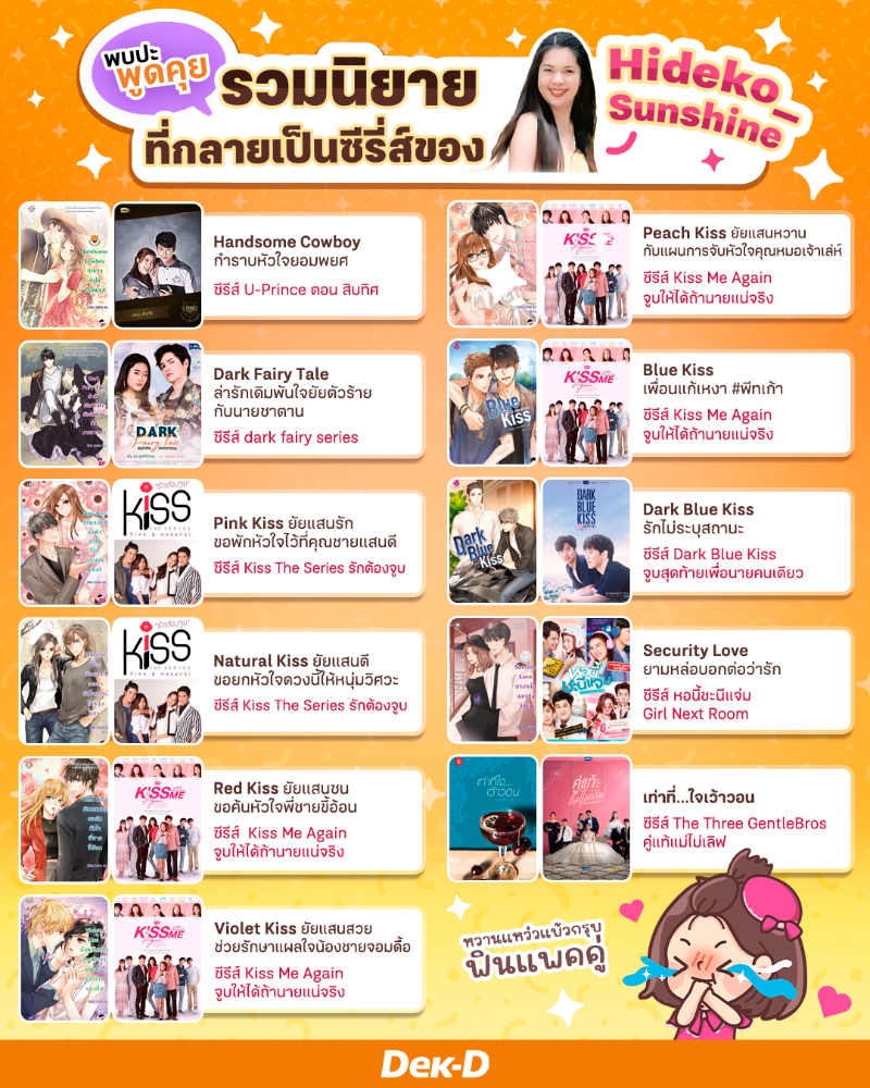 นี่คือคำพูดของ ‘คุณโอ๋’ หรือเจ้าของนามปากกา ‘Hideko_Sunshine’ นักเขียนนิยายแนวรักวัยรุ่น ผู้เติมสีสันให้ช่วงวัยเด็กของผู้อ่าน ผ่านเรื่องราวของตัวละครที่เธอสร้างสรรค์ขึ้น สำหรับพี่มะปรางเองก็มีนิยายในดวงใจของนักเขียนท่านนี้เช่นกันค่ะ ไม่ว่าจะเป็น SEXY SENSEI ปฏิบัติการรักร้าย มัดหัวใจผู้ชายร้ายลึก หรือ Handsome Cowboy กำราบหัวใจจอมพยศ ซึ่งถูกนำไปสร้างซีรีส์ U-Prince ด้วย นอกจากนี้ยังมีผลงานอีกนับร้อยที่ครองใจแฟนๆ มาจนถึงวันนี้ค่ะ