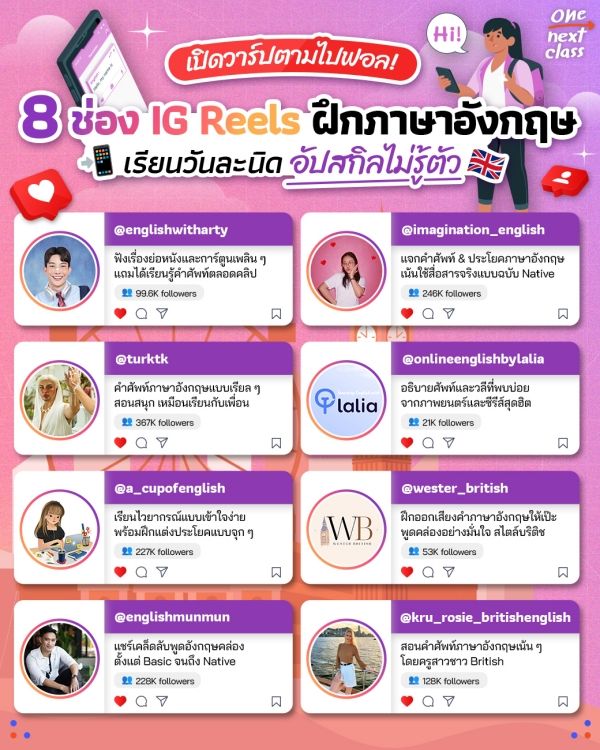 ใครชอบไถฟีด Reels และอยากอัปสกิลภาษาไปในตัว วันนี้ One Next Class #ชีวิตติดเรียนรู้ ขอแวะมาเปิดวาร์ป 8 ช่องสอนภาษาอังกฤษใน IG ที่น่ากดฟอลเอาไว้ คัดมาให้หลายสไตล์ ทั้งสายติวสอบ สายฮา สายบันเทิง รวมถึงเน้นสถานการณ์จริงในชีวิตประจำวัน รับรองว่าดูเพลิน ได้ความรู้ แถมกระชับ เข้าใจง่ายในไม่กี่นาที // ใครเป็นสายชอบส่ง Reels ให้เพื่อน ตามไปฟอลเล้ยย~