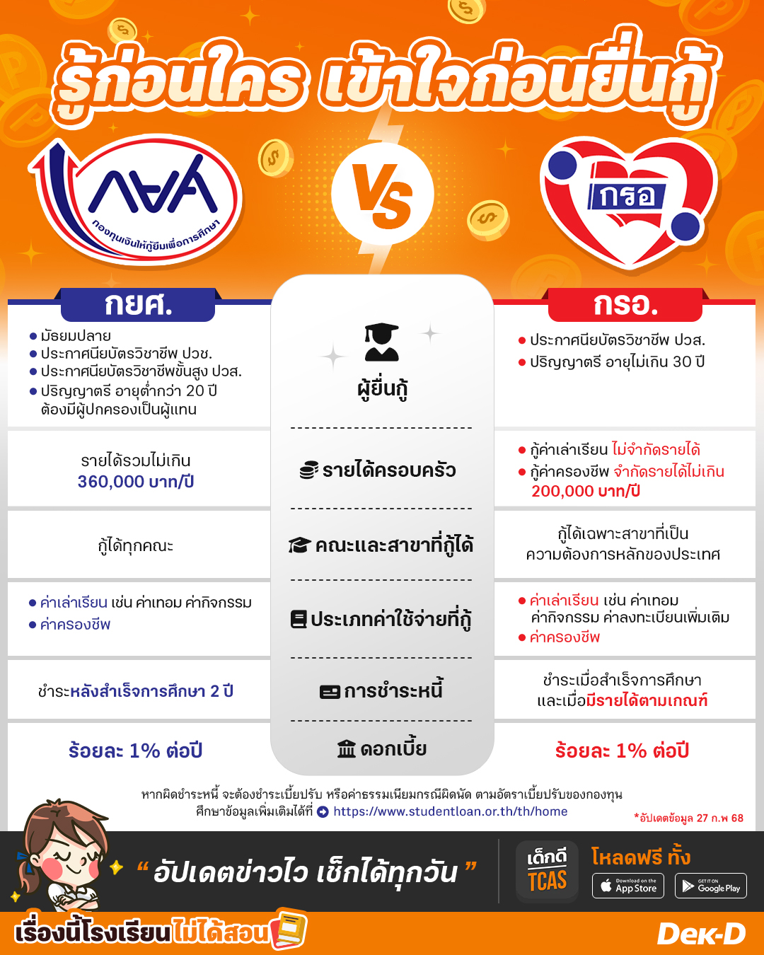 สวัสดีน้อง ๆ มัธยม และมหาลัยทุกคนค่ะ หลายๆ คนอาจจะคุ้นเคยมาบ้างเกี่ยวกับการกู้ กยศ. และการกู้ กรอ. ซึ่งทั้งสองอย่างนี้เป็นการกู้ยืมเงินเพื่อการศึกษาเหมือนกัน แต่มีลักษณะที่ต่างกันอย่างไร วันนี้พี่จะมาเปรียบเทียบให้เห็นกันชัด ๆ พร้อมแอบกระซิบบอกทริคเล็ก ๆ ในการเตรียมความพร้อมก่อนกู้ยืมเงินเพื่อการศึกษา เพื่อให้น้อง ๆ ชาว Dek-D ได้เตรียมความพร้อมล่วงหน้าก่อนยื่นกู้กันค่ะ